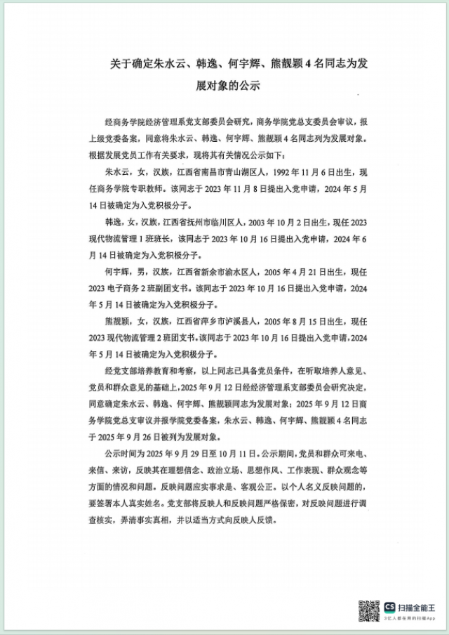 关于确定朱水云、韩逸、何宇辉、熊靓颖4名同志为发展对象的公示