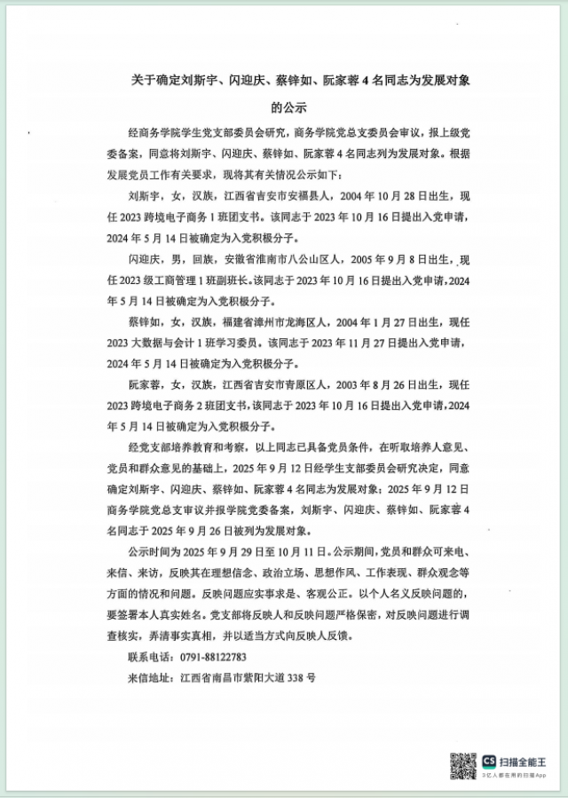 关于确定刘斯宇、闪迎庆、蔡锌如、阮家蓉4名同志为发展对象的公示