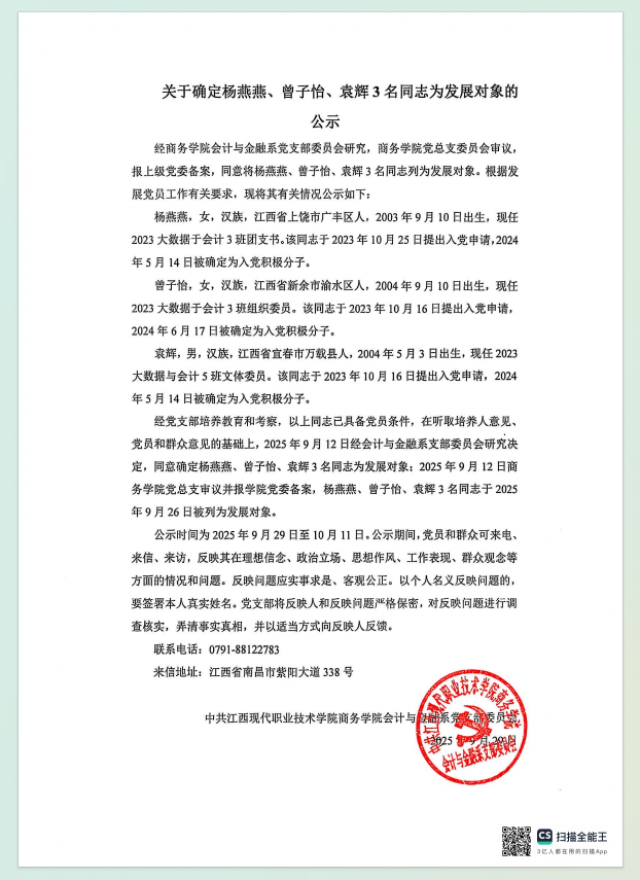关于确定杨燕燕、曾子怡、袁辉3名同志为发展对象的公示